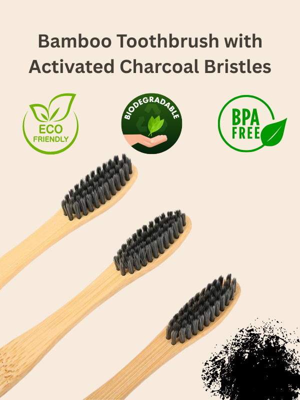 This bamboo toothbrush is made with 100% natural bamboo handle, BPA-free soft bristles Infused with activated charcoal. Biodegradable and BPA free toothbrush.